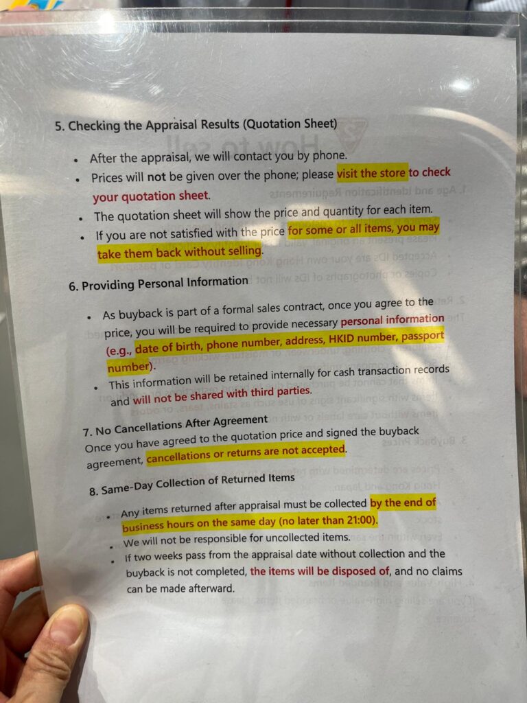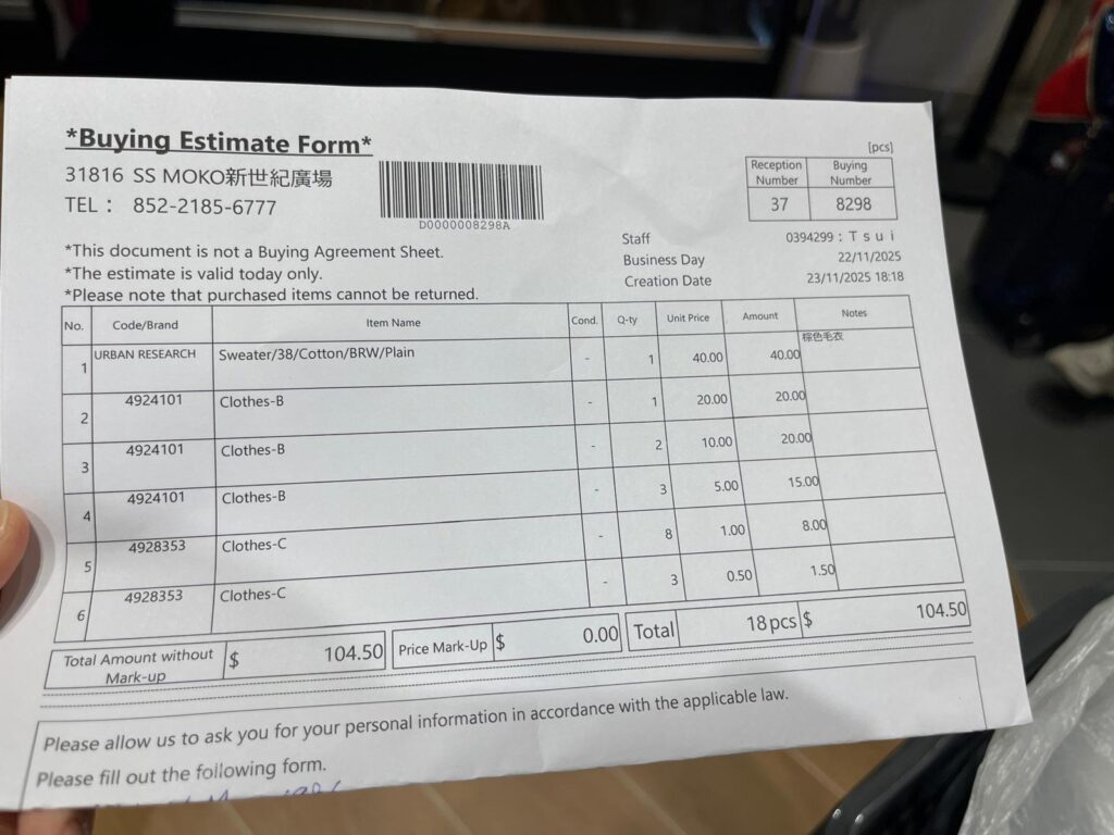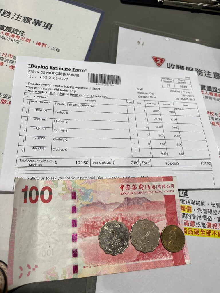 なになに~ふむふむ。18着にお値段が付いた様子。一着HK$1未満のものもあるんか…一番値段が高く付いた物で1着HK$40。これだけブランド名が記載されてる。日本で買取りに出した時と金額はさほど変わりない印象です。内容合意のサインをし、買取金を現金で受取ります。