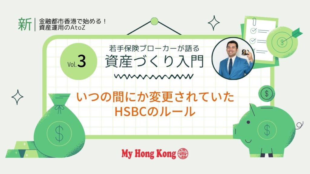 18回まで続いた「金融都市香港で始める!資産運用のAtoZ」は、執筆ご担当者が二十八智大さんにバトンタッチします。これに伴い、プチ・リニューアル版として「若手保険ブローカーが語る資産づくり入門」を開始いたします! 第3回目は、「いつの間にか変更されていたHSBCのルール」です!