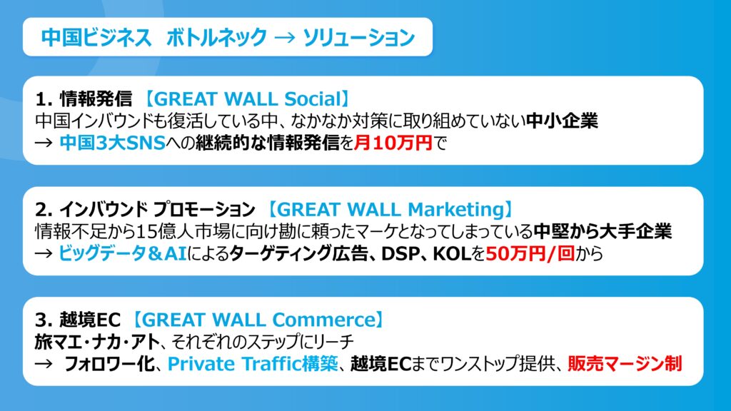 WeChat、Weibo、小紅書(RED)の3媒体を月額10万円で運用。投稿作成・翻訳・配信をAIが担当し、月5,000回の閲覧保証で中小企業でも導入できるパッケージサービス化に成功。