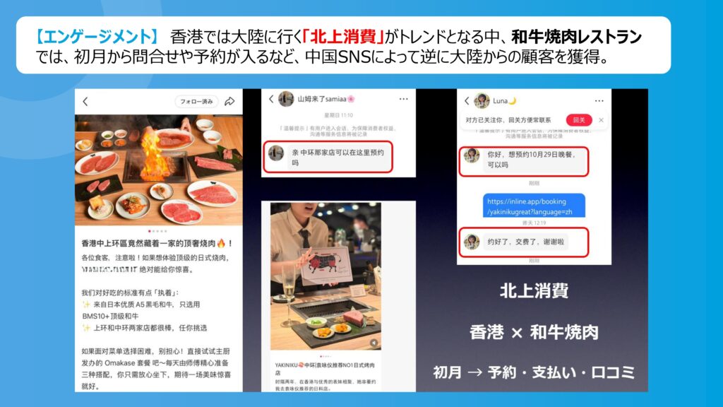 同社では、WeChat・Weibo・小紅書(RED)の3大SNSを分析対象に、AIが自動生成する中国語コンテンツで配信サポートを行っています。月額10万円で運用・翻訳から効果保証(5,000インプレッション)までを一括提供。香港の焼肉店では「投稿初月から中国本土からの予約が毎週コンスタントに入るようになりました」との実績も。