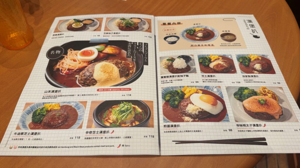 毎日店内で肉を挽き、牛と豚の黄金比で仕上げる製法は、香港店でもしっかり受け継がれていて、朝から夜まで楽しめるファミリーレストランスタイルで提供されています。