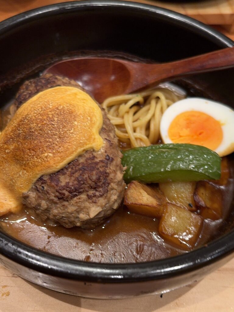 店名を冠した「山本ハンバーグ」は、チーズハンバーグに、味噌と和風だしを合わせた特製ソース+パスタ、季節野菜、卵が添えられ、その上にスフレチーズも載せられるという、見た目も味もインパクト大のメニュー。こちらに、ごはんとお味噌汁がつきます。