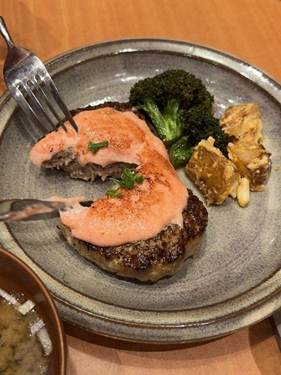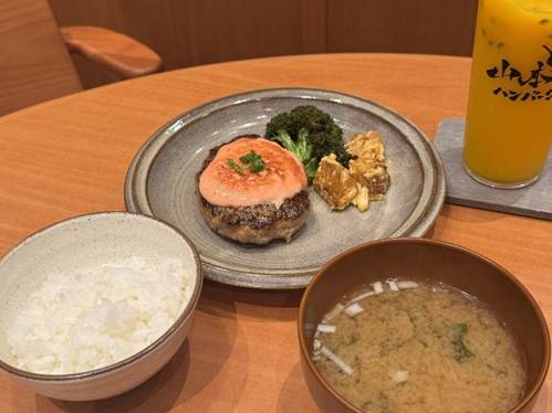 こちらは、柔らかくてジューシーなハンバーグの上に、ピリ辛の明太子をたっぷり載せてあります。個人的には、看板メニューのチーズ入りパティより、こちらのシンプルなパティのほうが好みでした。こちらにも、ごはんとお味噌汁が付いて、定食スタイルでいただけます。
