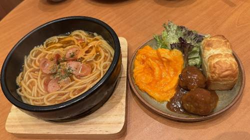 ● 山本ハンバーグのモーニング(ソーセージとトマトスープのパスタ付き)