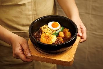 石鍋で提供され、ふわふわのオランデーズスフレがのった看板メニュー。