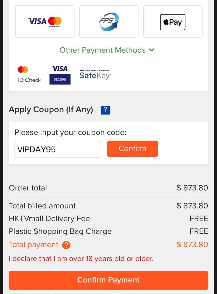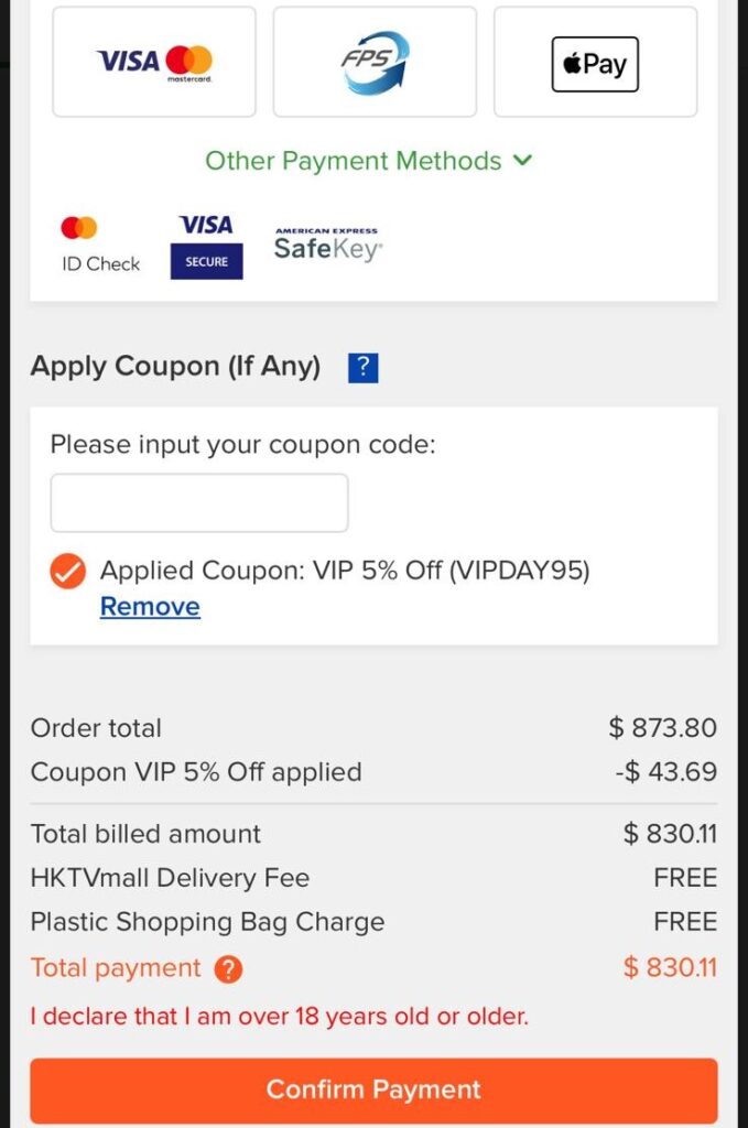 私はHKTVmallのVIP会員なので金曜日に配布される5%オフクーポンを利用しています。