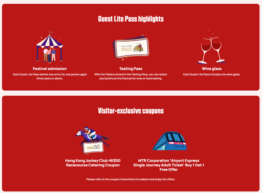 | テイスティングパス | 入場券1枚(HK$40)8トークン(HK$200)スタンダードワイングラス1杯(HK$130) HK$370相当 | 298香港ドル |