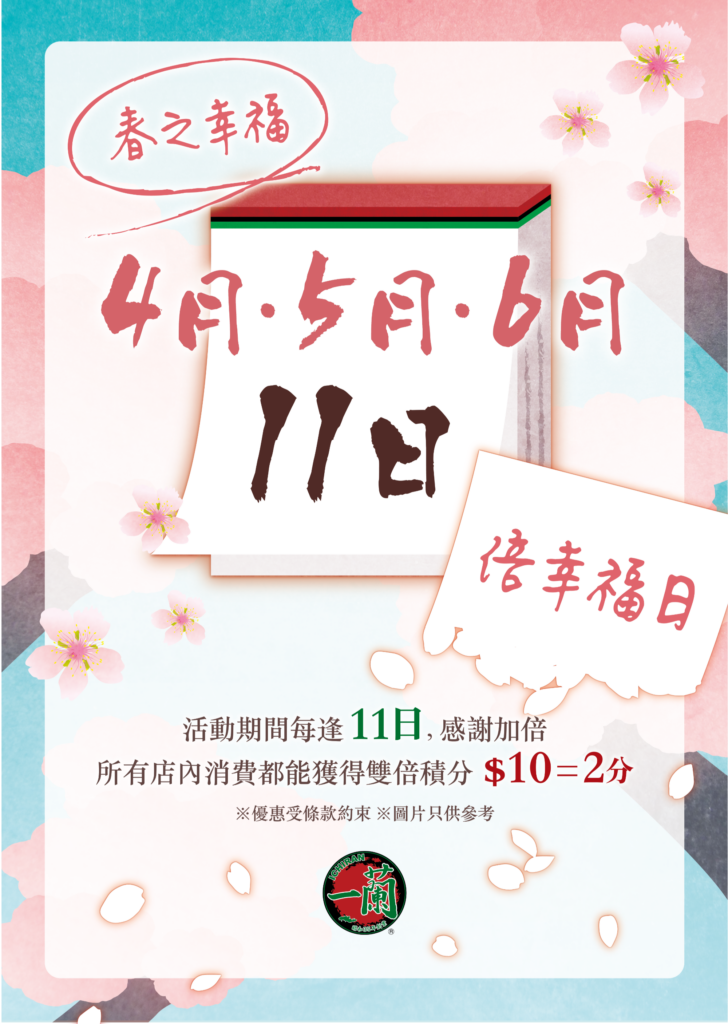 一蘭香港では、アプリ会員様向けの特典キャンペーンと香港限定グッズ販売を実施します。アプリ会員ポイント2倍キャンペーン「倍幸せ日」は、2026年4月11日、5月11日、6月11日の3日間に開催され、期間中に店内でご飲食いただいた会員様へ通常の2倍のポイントを付与。また、香港限定ピンバッジセットを店内ガチャにて販売します。販売期間は4月3日から5月31日までで、在庫がなくなり次第終了となります。