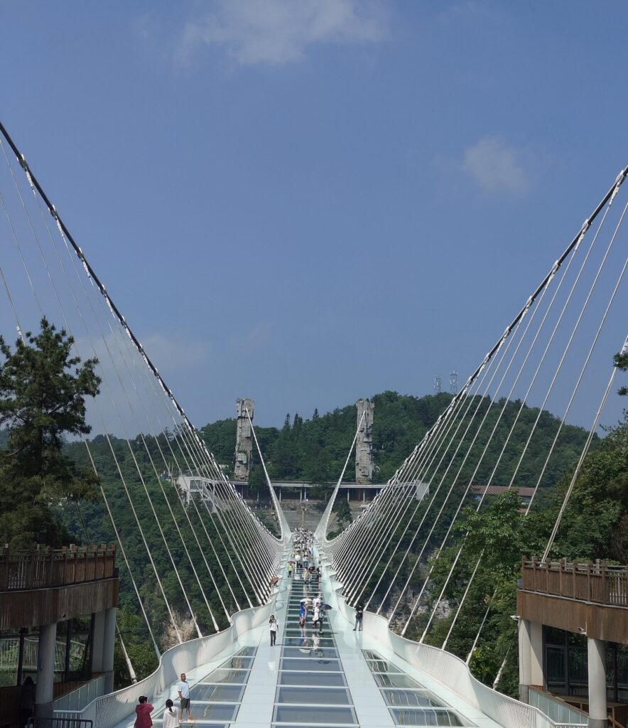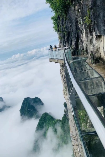 張家界⼤峡⾕ガラス吊り橋は世界最⻑‧最⾼のガラス底吊り橋です。 2016 年 8 ⽉ 20 ⽇に オープンし、全⻑ 430m 、幅 6m 、⾼さ 300m の透明ガラス床で峡⾕の絶景を⾜元に眺められるスリル満点の名所。⾼所恐怖症には過酷だが、アドレナリン全開の体験で間違いなし!