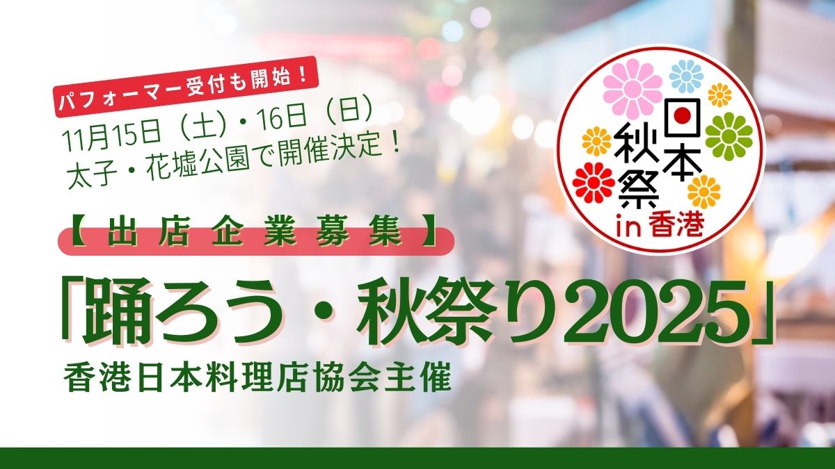 今年も「踊ろう・秋祭り2025」を、11月15日(土)・16日(日)に花墟公園(Fa Hui Park)で開催いたします。この秋祭りは、いつも日本を愛し応援してくださる香港の皆様への感謝を込めて、日本料理の魅力や日本文化への親しみをさらに深めていただくことを目的に毎年開催しています。