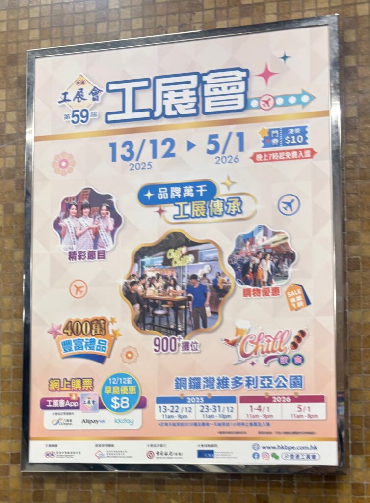 今回は、MTRの駅構内でもたくさん広告を見かけて気になっていた、銅鑼湾(コーズウェイベイ)のビクトリアパークで開催されていた 「第59回 香港工展曾」 に行ってきました。