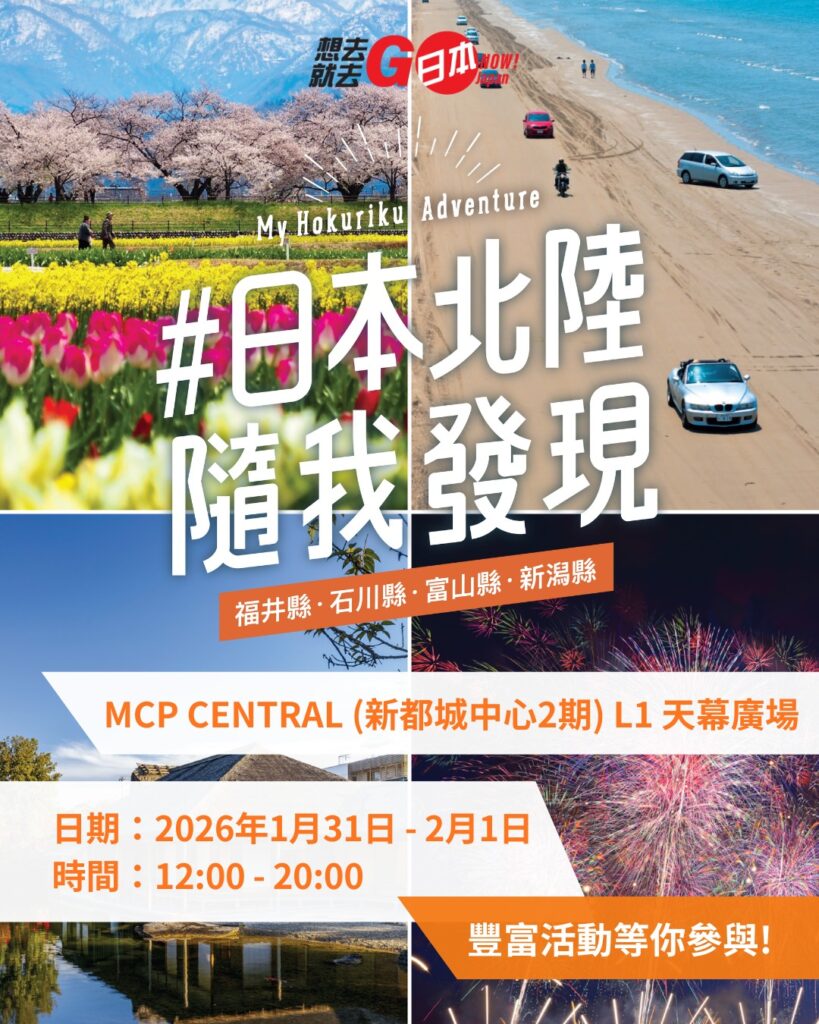 日本政府観光局(JNTO)は今週末、MCP新都城センターで「日本北陸・随我發見」イベントを開催します。北陸最新の旅行情報をはじめ、伝統工芸ワークショップ、旅行系KOLによるトーク、北陸直送ジュースの試飲など盛りだくさん。北陸の自然と文化の魅力を体... -