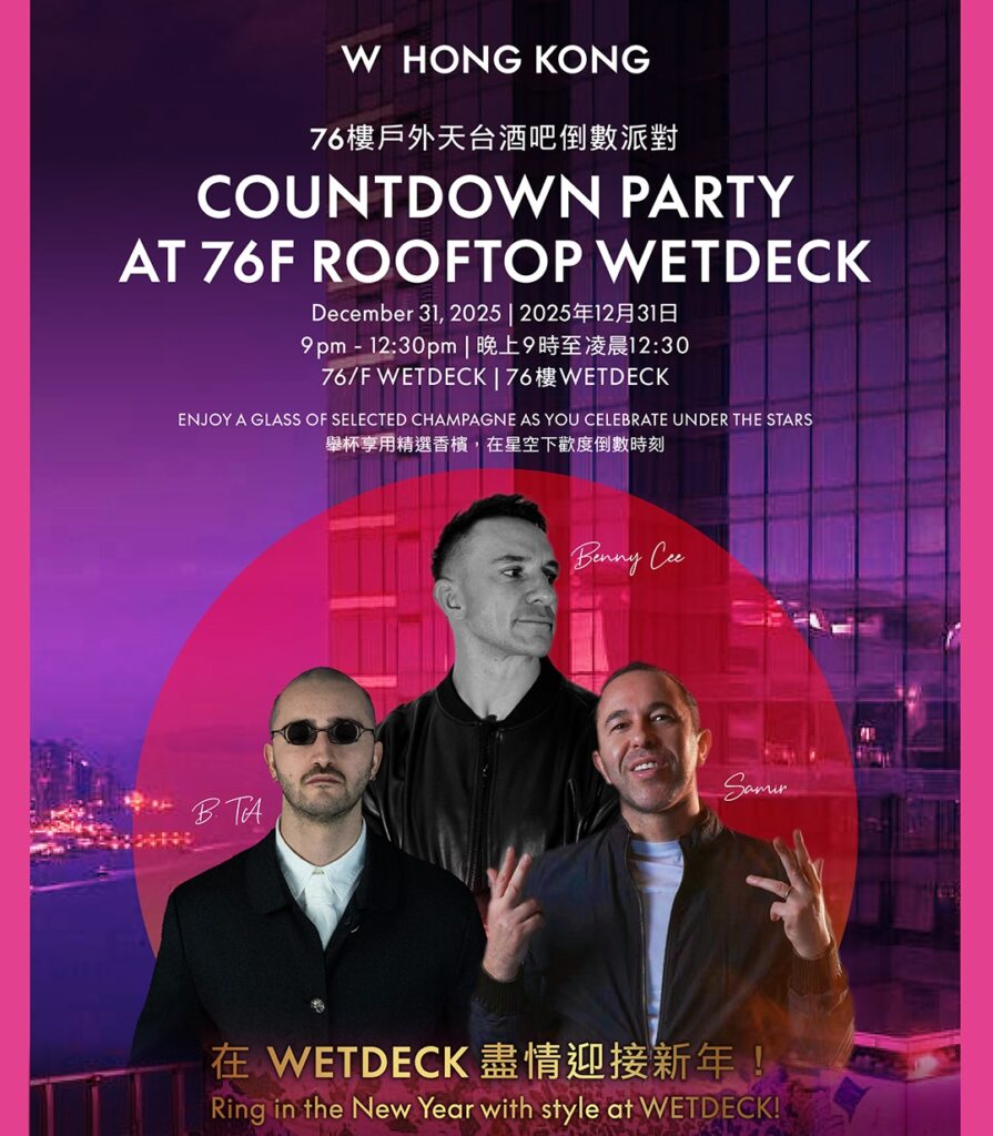 W Hong Kongで開催される「Extremely WOW Countdown Party」は、年越しの瞬間を贅沢かつエネルギッシュに迎える2部構成のカウントダウンイベントです。 76階のWETDECKで星空の下、DJ Benny Ceeのプレイとシャンパンを楽しみながら2025年の終わりを迎え、深... -