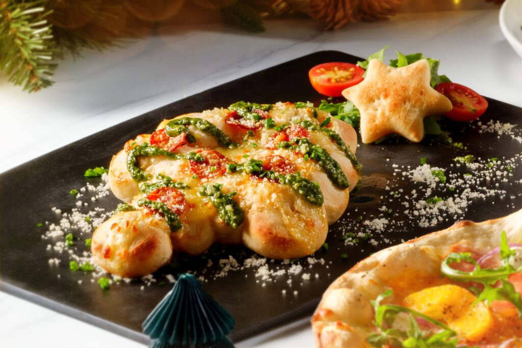 サクサクのドウボールをクリスマスツリー型にアレンジ。ペパロニ、ダブルチーズ、バジルペストで華やかに。
