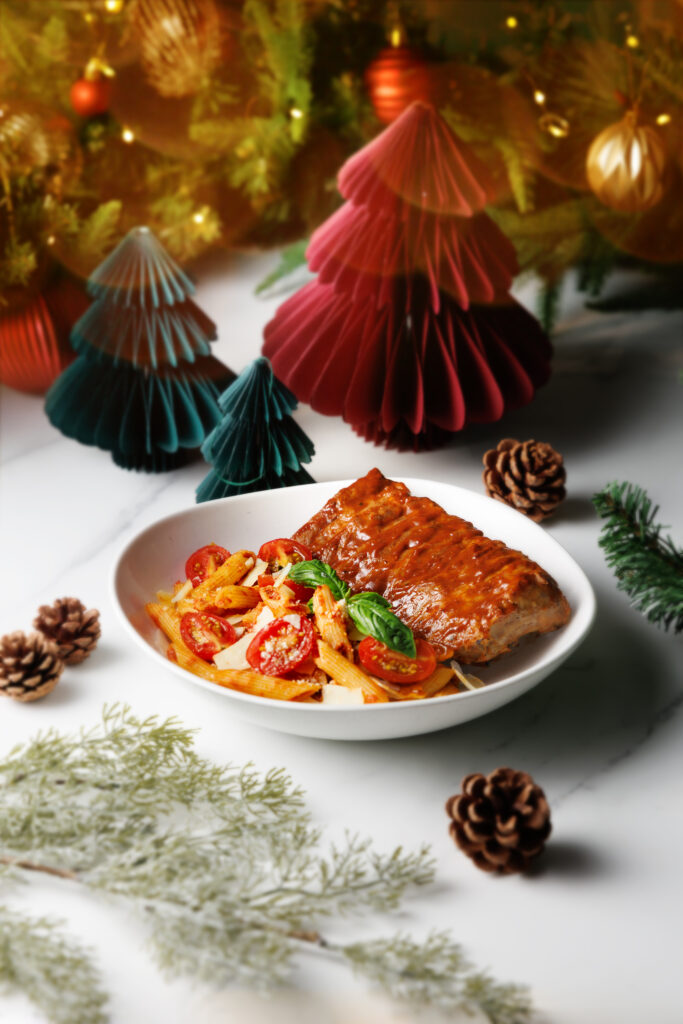 イタリアントマトソースで煮込んだポークリブとペンネの濃厚な組み合わせ。