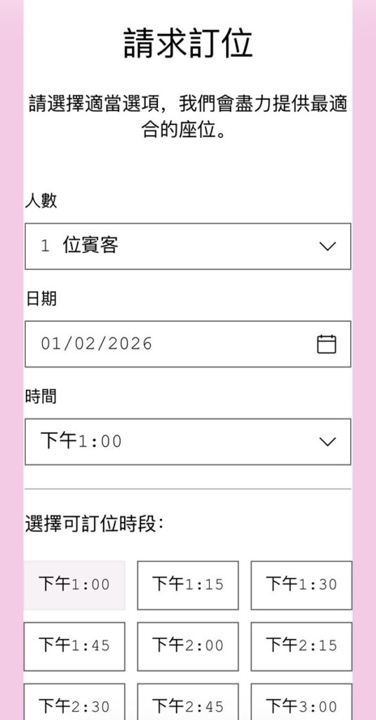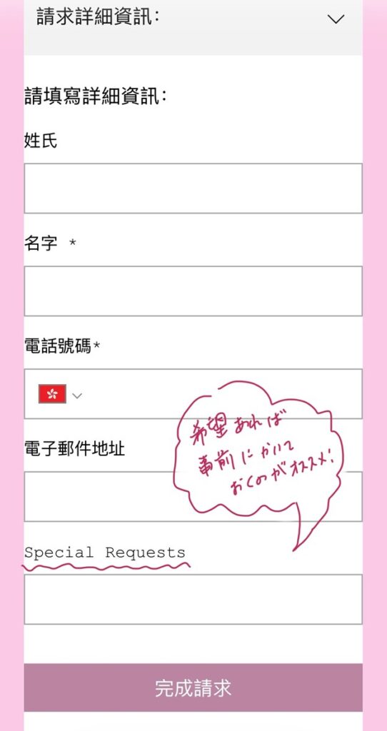 人数や日時、名前と電話番号、リクエスト欄があるのでそちらを記入して送信します。