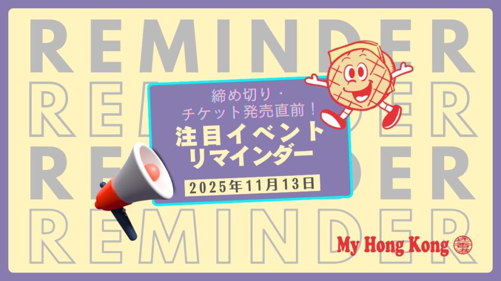 香港ではイベントが盛りだくさん! ここでは、申込締切・チケット発売直前のイベントを定期的にリストアップします! 2025年6月6日イベントを追加しました。 申込締切・チケット発売直前!注目イベントリマインダー チケット発売日間近のイベント 発売日間...
